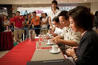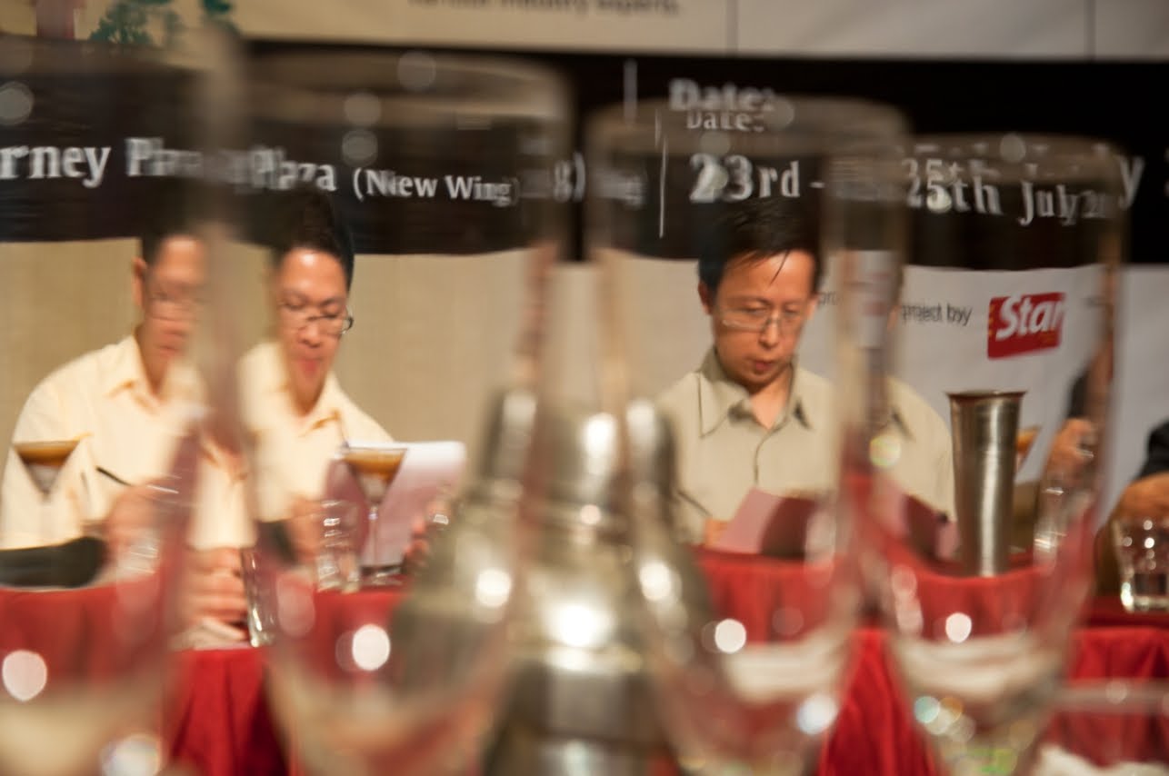 Well, back to the topic, when I reach the new wing of Gurney Plaza, I saw Victor was busing on the machine and the area setup, as he told me the contest will gonna start soon, and he would like to make the contest as same as the standard follows international contest standard. The contest area has two brewing machines and grinding machines setting at both left and right side from the judges table for two contesters, after the introduction of the rules and all the hardware setting, the contest had started. Every contester was given 15 minutes to prepare their tools, setting the grinding machine to grind the fresh roasted bean into powder and taste the espresso they brew, and once the preparation time is end, they are not allowed to touch any thing on the table until the judge call them to start making their coffee. 15 minutes are given for the contesters to make 3 kinds of drinks which are Espresso, Cappuccino, and own signature drink, and 4 cups of each kind of drinks need to present to the judges. I wonder how amazing the contesters need to control their time to make the nice coffee. During the contesters making the coffee, there will have a technical judge to the way they handle the tools and the method they use to suppress the coffee powder, and the way they clean up the brewing machine. And of cause, the other 3 judges are judging the taste of the coffee that the contesters presented.