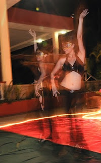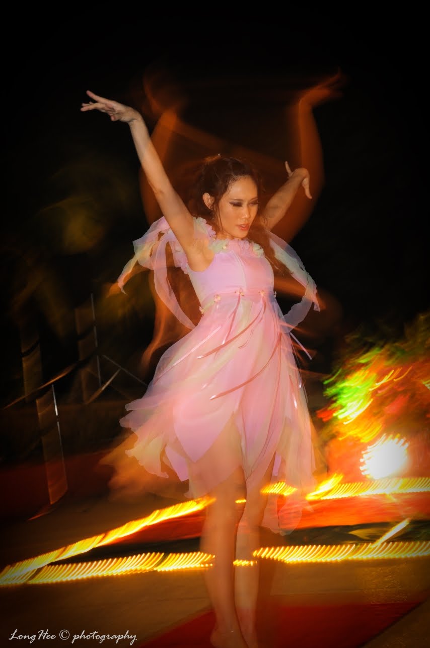 After a light dinner, the performance kicked started as Vivian, Mee Mee, Shee Loo and Ginny are the first group to perform…at the same time, it is also for me to start re-adjusting my camera setting to suit to the performance feel…motion blur but with sharp for the subject…it is the main concern to me….it was tough as at outdoor and night shooting, there are limited light source and limited parties for creating light bouncing….well, this is the challenge…I can only depend on the available light around the stage and pool side and play around with the angle of flash gun hooked up with defuser…some experiment had done to put into shutter priority mode and slower down the shutter speed, it can provide me some motion blur but the subject is blur too and unable to see the dancers’ emotion on their face, with remind back the “creative flash” method where to swing the camera after fired the flash in slower shutter speed… I have the other idea, since the dancers keep moving, so I just fire up the flash to get a sharp image but in slower shutter speed to let the motion blur exist, and the effect is absolutely excided and give me the feel of movement and the emotion of the pretty face of the dancers are clearly seen during their performance….