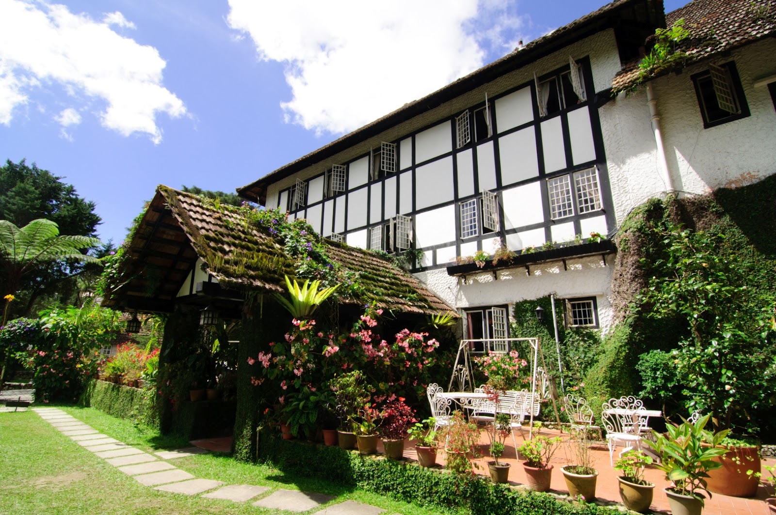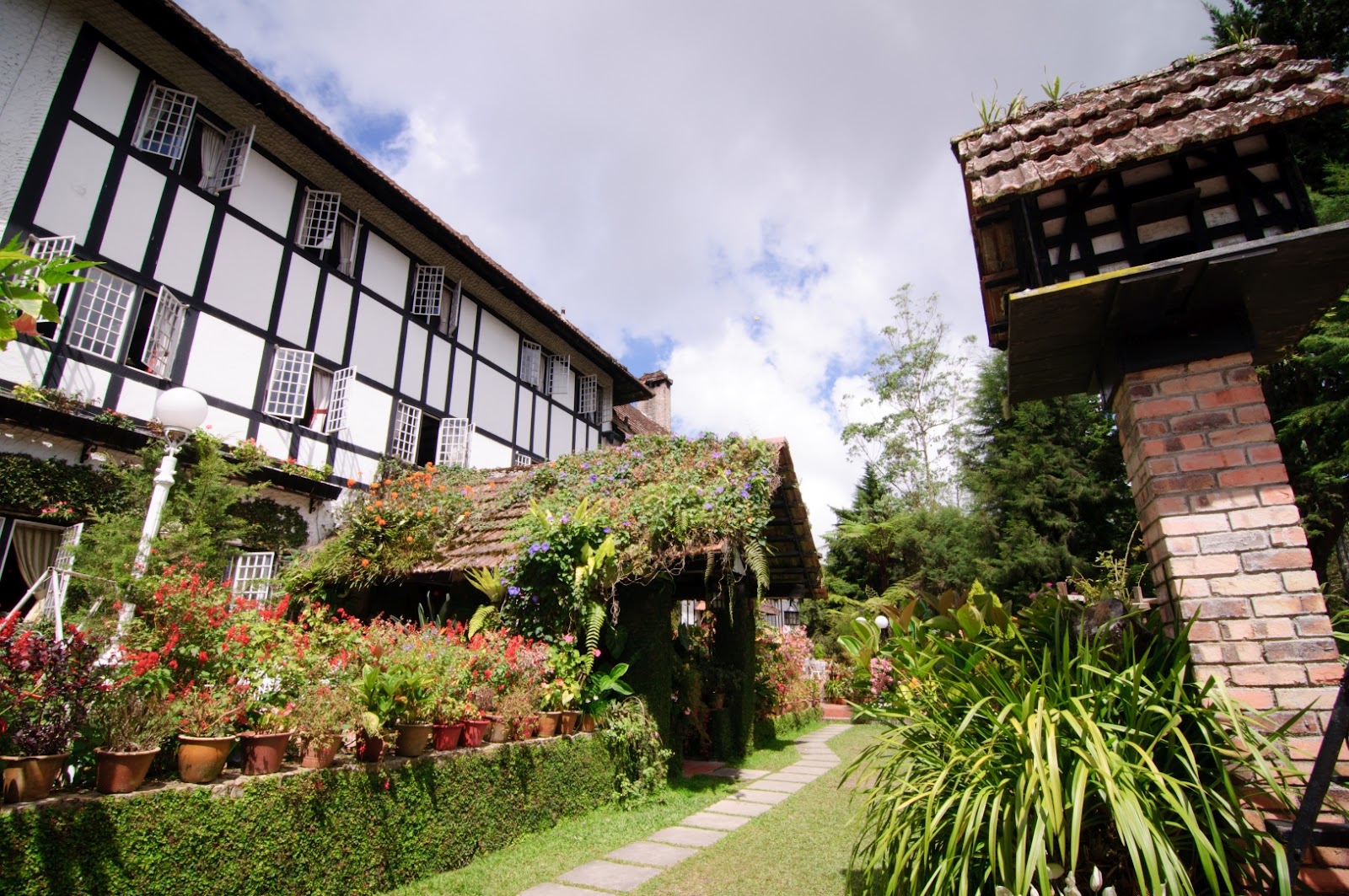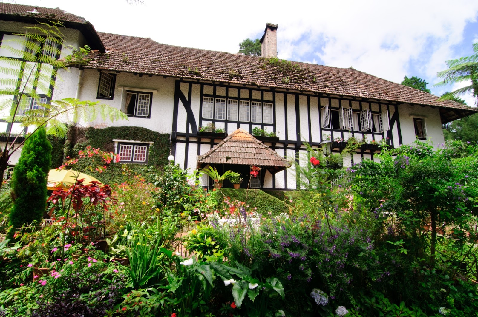 The front garden of the hotel planted with variety flowers making the overall
