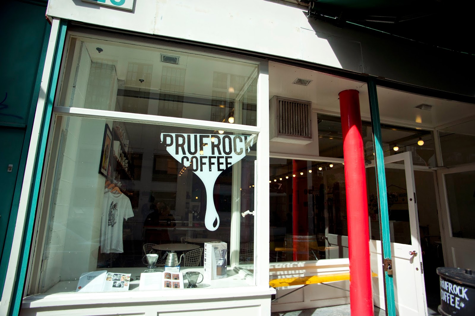 The Prufrock cafe staying at Leather Lane at Holborn, London. By taking the Central tube train and exit at the Chancery Lane station, the Leather Lane is at the opposite of the HSBC bank, which has a short walking street to the driving lane, the Prufrock cafe is staying at the left side after passing by the junction of the Dorrington St.