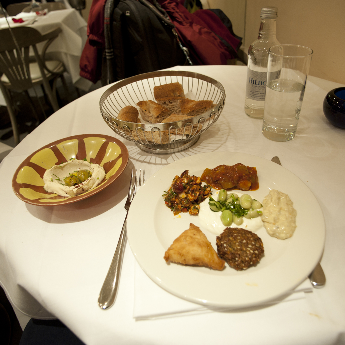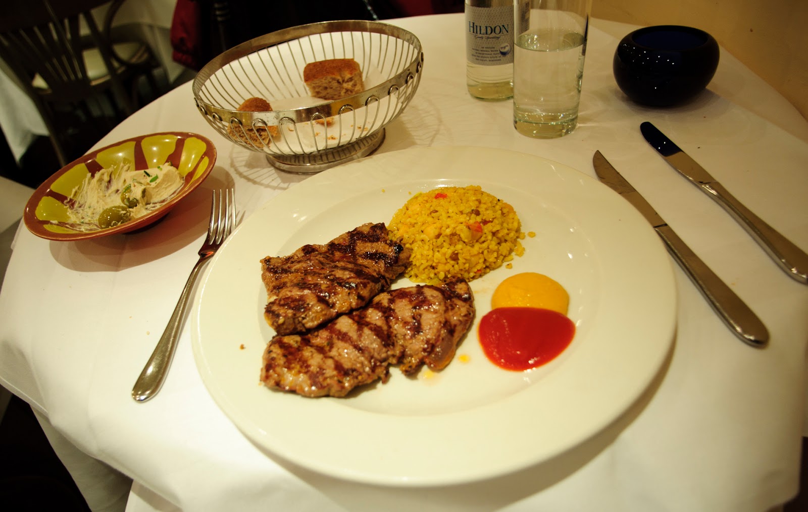 It seems a norm that a basket of bread with butter will be serve at the beginning of the meal when dine in at the restaurant in London (or UK), while this time was coming with some olive and cream instead of butter. And the next would be the 6 type middle east light dishes of the appetizer.